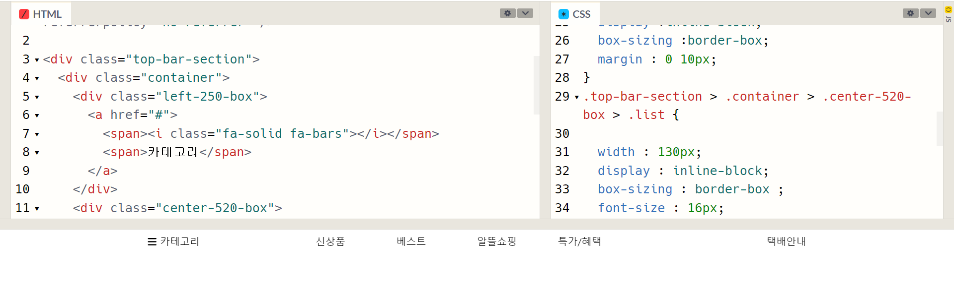 우리가 만들 부분은 저 위에 카테고리, 신상품~ 배송안내 저부분을 만들어 볼것이다.
