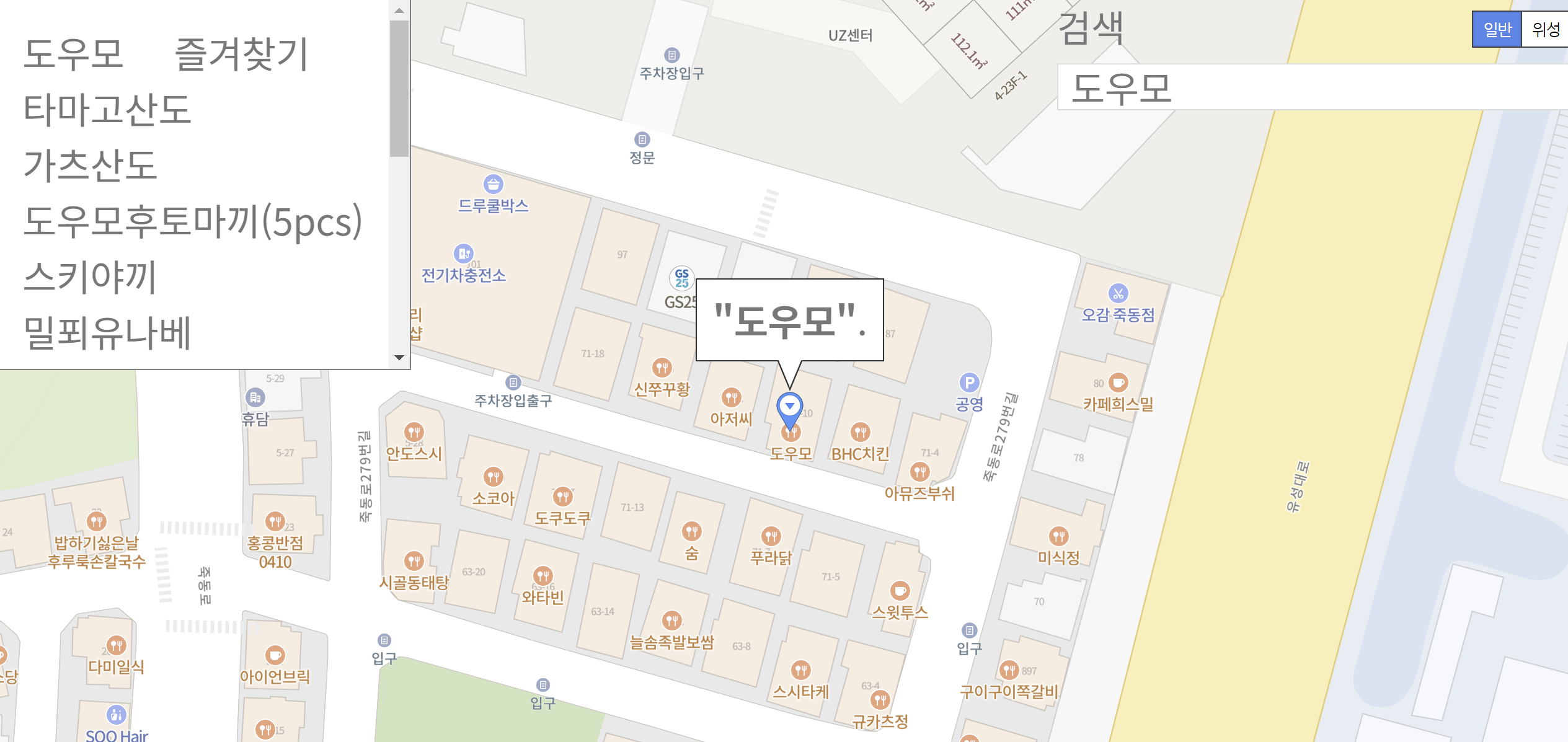 그럼 이제 사진처럼 바로 도우모를 검색하면 도우모에 위치에 핑이 찍히고 거기로 지도 중심이 이동된다.!!!