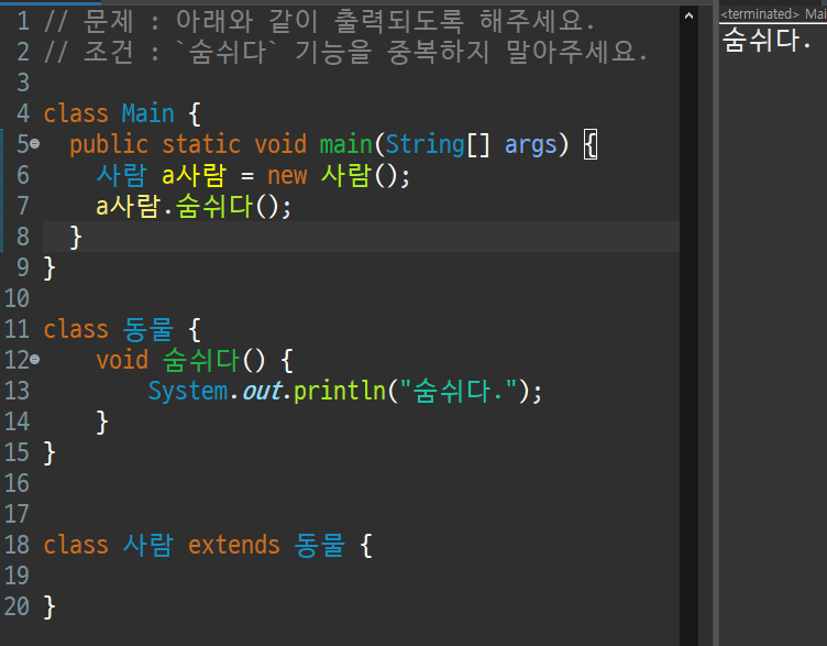 // 조건 : `숨쉬다` 기능을 중복하지 말아주세요.