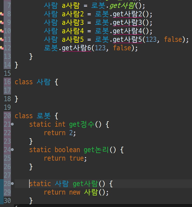 사람 a사람 = 로봇.get사람() 이형태는 변수 a사람에 객체를 연결해주는 형태이다.
